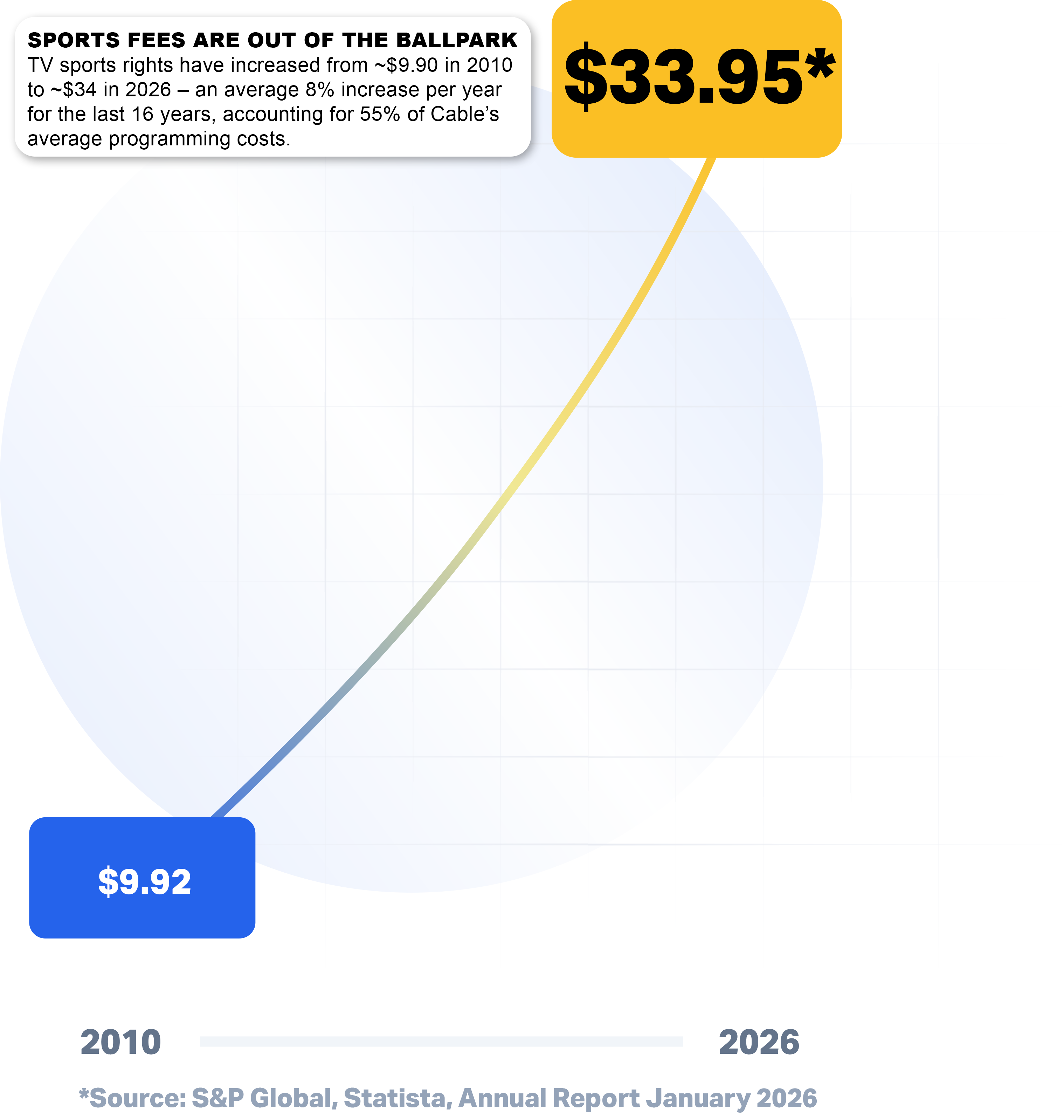 TV providers have tried for years to minimize out-of-control sports programming costs. Most broadcast stations and cable networks that carry sports require that we offer their channels in our most popular levels of service, forcing almost everyone to pay for sports programming - whether they watch it or not.